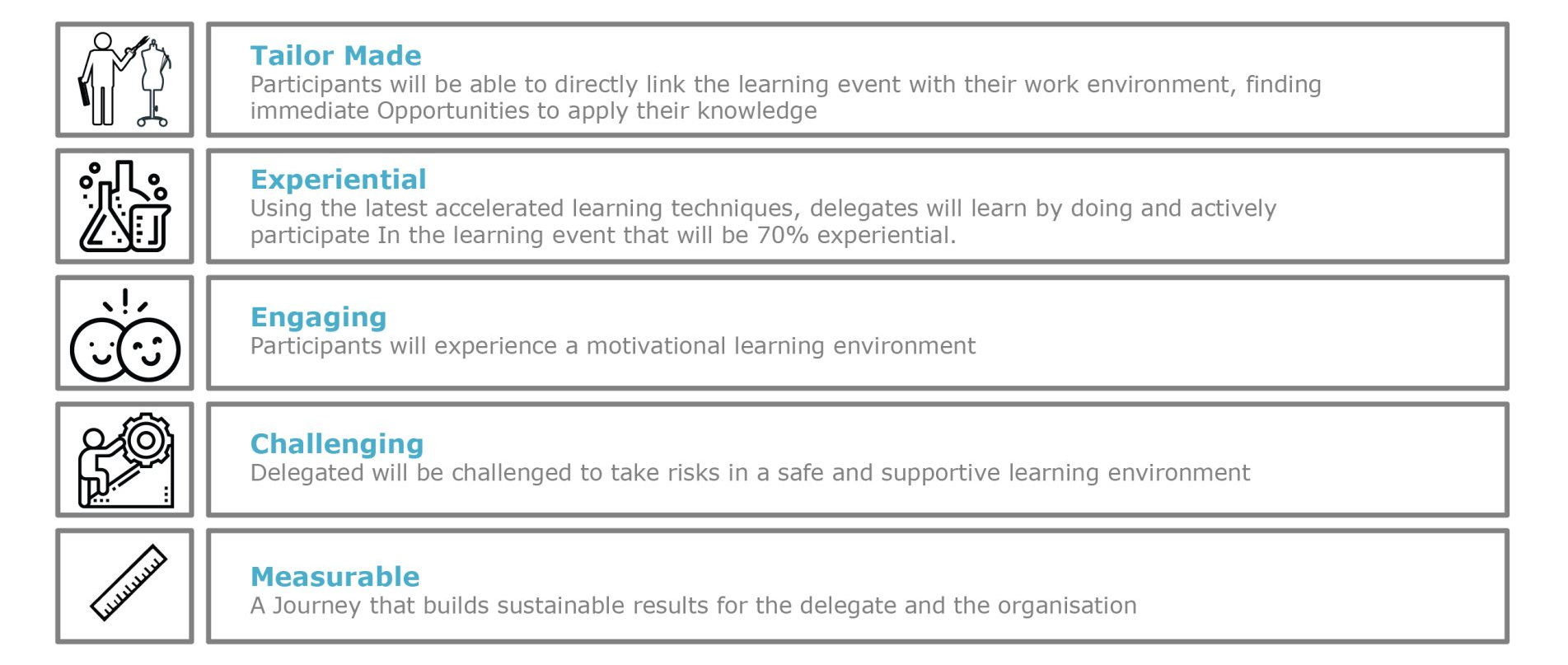Each Engage learning intervention is delivered using our design principles. These ensure that your organization receives a 'tailor made' learning journey that is 'experiential, engaging and challenging' for the participants with 'measurable' results.